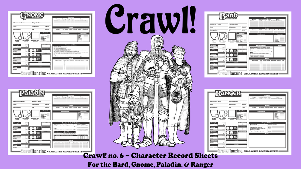 Official Character Record Sheets for the character classes found in Crawl! fanzine no. 6!