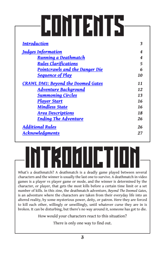 - CRAWL DM1: Beyond the Doomed Gates — a pointcrawl adventure location where it will all go down. The dungeon features: Portals! Traps! Hazards! Powerful Weapons! Runes of Power! and more!